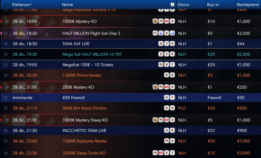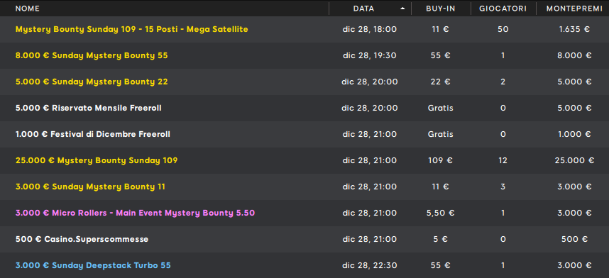 Ma consultate pure il resto del programma domenicale… Buona fortuna! Per giocare nei tornei di iPoker, il requisito è avere un conto aperto per esempio su una di queste rooms: SnaiBet365, LottomaticaGoldbet o Eurobet.
