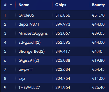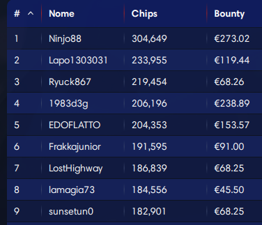 Comanda nettamente nel count provvisorio ‘Ninjo88’ con 304.649 di stack. Considerate che per tutti sono 30.000 le chips iniziali. Il miglior bounty è proprio quello da 273 euro del leader. A voi i piani alti nel dettaglio…