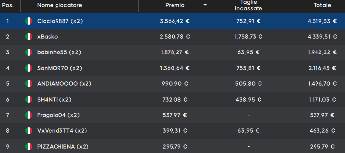 Meglio di lui economicamente parlando fa il secondo ‘xBasko‘ perché con 1.758 euro di taglia totalizza 4.339 euro. Va citato poi il 20esimo classificato ‘Zazzu777‘ perché la sua taglia recita 2.816 euro!
