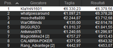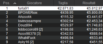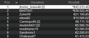 Alle ore 3:26 per l’esattezza ‘jhonny_bravo48‘ ha preso 45.033 euro mentre il runner-up Francesco ‘Biri07501’ Biribao si accontenta di 38.022 euro. Terza piazza e 21.190 euro per ‘Zuker69’, quarta e 13.586 euro per ‘stevu82’.