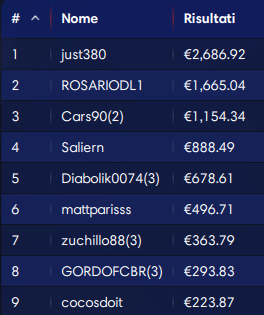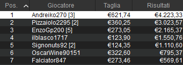 10.000€ Giovedì 6 Max (buy-in 20, montepremi 13.992, iscritti 795)