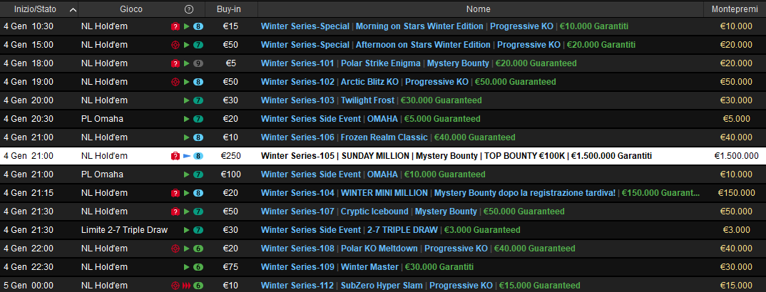 Nelle room PokerStars e Sisal si continua a far sul serio, magari con la voglia di farsi un bel regalo di inizio 2025. Allora spazio alle Winter Series con ottimi garantiti e soprattutto con il SUNDAY MILLION da un milione e mezzo di euro in palio!