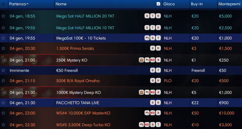 Interessante pure il WINTER MINI MILLION che propone uno zero in meno nel montepremi per 20 euro di buy-in. Per prendervi parte puoi aprire un conto gioco su PokerStars (se non lo hai già) o Sisal Poker.