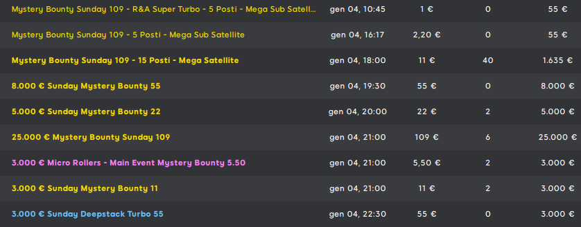 Finiamo con la room 888Poker che propone ancora Mystery Bounty con vari buy-in e montepremi… L’evento più goloso stasera è nuovamente il Mystery Bounty Sunday 109: 25mila euro garantiti alle ore 21:00 a 109 euro di iscrizione.