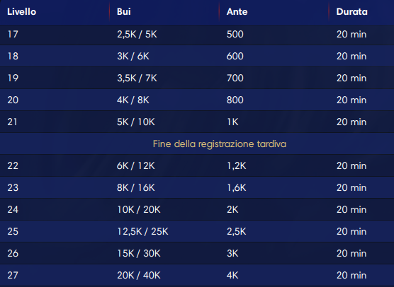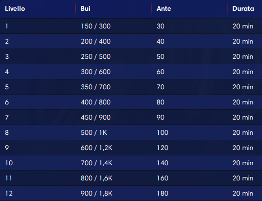 Si parte per la cronaca dai bui 150/300 con ante già in mezzo (30). Vuol dire che il massimo stack iniziale è di oltre 330 bui. Un’ottima dote per chi vuol far valere tutte le proprie skills. Bisogna cercare fin da subito di costruirsi una montagnola digitale importante per presentarsi con ottime chance nelle fasi più calde…