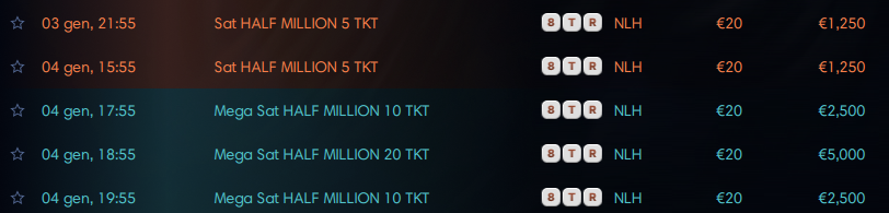 Tra i satelliti last minute utili per prendere parte a questo grande appuntamento dobbiamo per forza sottolineare il Club del Poker Half Million di sabato 3 gennaio. Grazie al nostro Club del Poker e alla room Lottomatica ci saranno appunto cinque ticket regalati dal valore complessivo di 1.250 euro. Basta conoscere la password per partecipare.