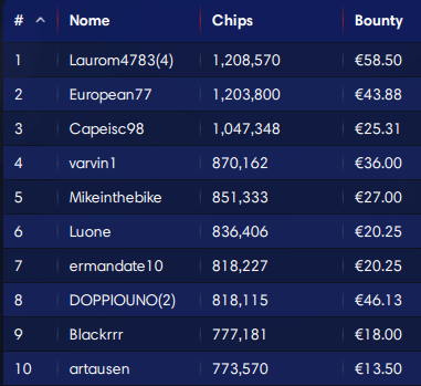 Nell’attesa comanda nel count ‘Laurom4783‘ di poco davanti a ‘European77’. Anche ‘Capeisc98’ sta sopra il milione di gettoni. La migliore taglia è quella da 73 euro di ‘V4p3‘, 31esimo. Ecco l’attuale parte alta della classifica pure qua: