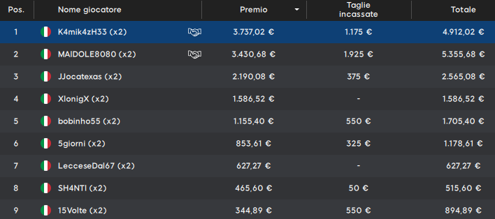 Il primo classificato ‘K4mik4zH33’ prende 4.912 euro totali in seguito a deal fatto con ‘MAIDOLE8080‘. Il runner-up economicamente è il vero vincitore perché incassa 5.355 euro.