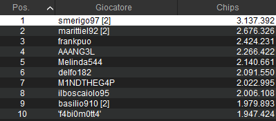 Un piccolo scalino nel payout è stato superato, quindi tutti hanno 182 euro assicurati. Si punta però alla prima moneta da 31.164 euro. La sogna soprattutto ‘smerigo97‘, dominatore del count con oltre 3 milioni di gettoni. Considerate che l’avg è di 802mila circa. A voi la top dieci.
