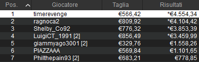 Tra 2.076 rientri e 783 ITM tutto è finito con un deal a quattro al final table. Alle ore 4:56 ha vinto ‘timerevenge‘ per 5.120 euro totali. Ha chiuso 22° ‘avfww‘ con 1.396 euro di taglia.