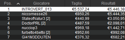 Dalle 19:00 c’erano altri 75mila euro garantiti in questo 7-Max Progressive KO. Qua abbiamo contato 672 rientri e 321 posti pagati. Alle ore 2:42 è arrivata la grande gioia di ‘INTROVERT_013‘. A lui ben 5.537 euro di taglia e in tutto 10.983 euro. Secondo posto e 6.294 euro per ‘niccomesse26’.