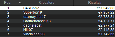 Finiamo con questo appuntamento High Roller 6-Max che garantiva 40mila euro dalle 22:30. Son stati qui 47 i posti pagati con almeno 406 euro. Alle ore 3:10 il trionfatore ‘B4RBANA‘ si prende 11.042 euro. Secondo posto e 7.957 euro per ‘Superbig19’.