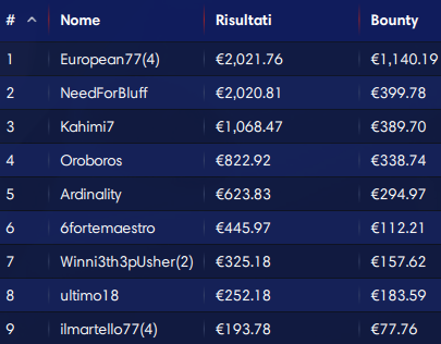 Seconda posizione da 5.968 euro per ‘NextLevelCMP91’, terza da 3.743 euro per ‘Propodave1619’. Bello anche il bounty da 1.155 euro del quarto ‘Gurffa7Gang’. Complimenti a tutti i finalisti!