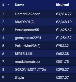 Finiamo con questo bel torneo del lunedì che ha totalizzato oltre 20mila euro di montepremi. In mezzo a 322 rientri e 180 posti ITM tutto è finito alle 4:30 per la cronaca. Il vincitore ‘DemarDeRozan‘ ha preso 3.814 euro mentre il runner-up ‘BRADPOT’ si fa bastare 2.348 euro.