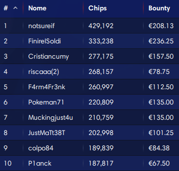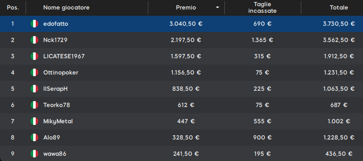 Il primo classificato ‘edofatto’ prende 3.730 euro totali. Ma il vero vincitore (economicamente parlando) è il 14esimo classificato ‘remyy‘ che si prende una super taglia da 4.620 euro per 4.753 euro totali! Belle anche le taglie di ‘daniele147’ (17°) e del secondo ‘Nck1729’.
