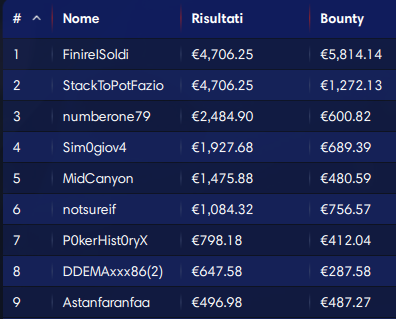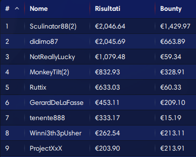 Erano le 5:07 quando ‘Sculinator88‘ ha trionfato per 3.476 euro in totale. Al secondo ‘didimo87’ vanno 2.709 euro per la cronaca. Completa il podio ‘NotReallyLucky’.