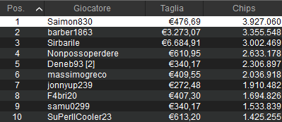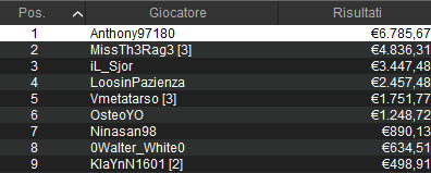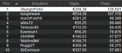 Chiudiamo questo altro appuntamento classico domenicale 8-Max che garantiva 30mila euro garantiti dalle 22:00. Il torneo si è stoppato in piena bolla con 28 left. I premi vanno da 202 a 2.982 euro. In cima al count troviamo ‘Xhungryf1shX‘ davanti a ‘burgerwave’.
