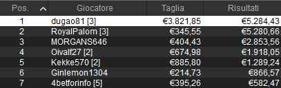 Piccola parentesi anche per questo domenicale classico da 40mila euro garantiti che ha totalizzato 282 rientri e 167 ITM. Alle ore 4:04 qui è arrivata la vittoria da 6.785 euro di ‘Anthony97180‘.
