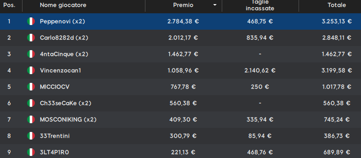 Il primo classificato ‘Peppenovi’ prende 3.253 euro totali. Va citato poi il quarto classificato ‘Vincenzocan1’ per la seconda migliore somma totale incassata. Ha chiuso invece in 45esima posizione ‘Aliegianlu‘ con la miglior taglia: 2.500 euro tondi.