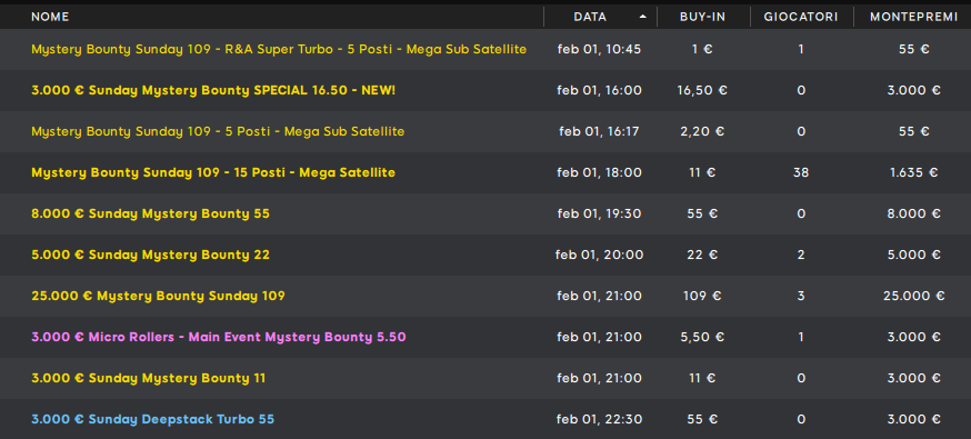 Anche su iPoker ci sono tornei da tenere d’occhio assolutamente, con un montepremi sicuro da 50mila euro. Finiamo sempre con i Mystery Bounty della domenica di 888poker. In bocca al lupo a chi si schiererà! Vi aspettiamo domani per tutti i report del caso…