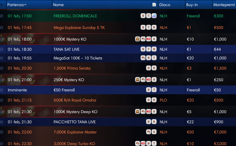 Ma consultate pure il resto del programma domenicale… Buona fortuna! Per giocare nei tornei di iPoker, il requisito è avere un conto aperto per esempio su una di queste rooms: SnaiBet365, LottomaticaGoldbet o Eurobet.