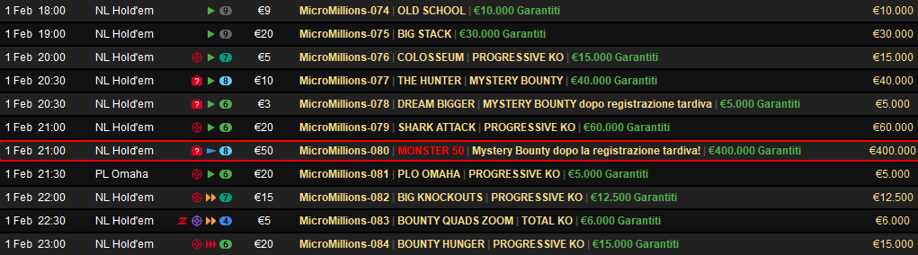 Questa domenica si deve fare nuovamente un giro tra la programmazione di PS e Sisal: si continua a far sul serio nei tornei MicroMillions. Spicca il MONSTER 50 da 400.000 euro garantiti in prima serata. Il buy-in è di 50 euro alle ore 21:00. Interessante pure l’evento SHARK ATTACK KO che propone 60mila euro nel montepremi per soli 20 euro di buy-in.