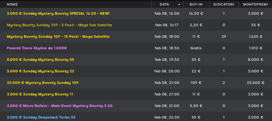Ma consultate pure il resto del programma domenicale… Buona fortuna! Per giocare nei tornei di iPoker, il requisito è avere un conto aperto per esempio su una di queste rooms: Snai, Bet365, Lottomatica, Goldbet o Eurobet.