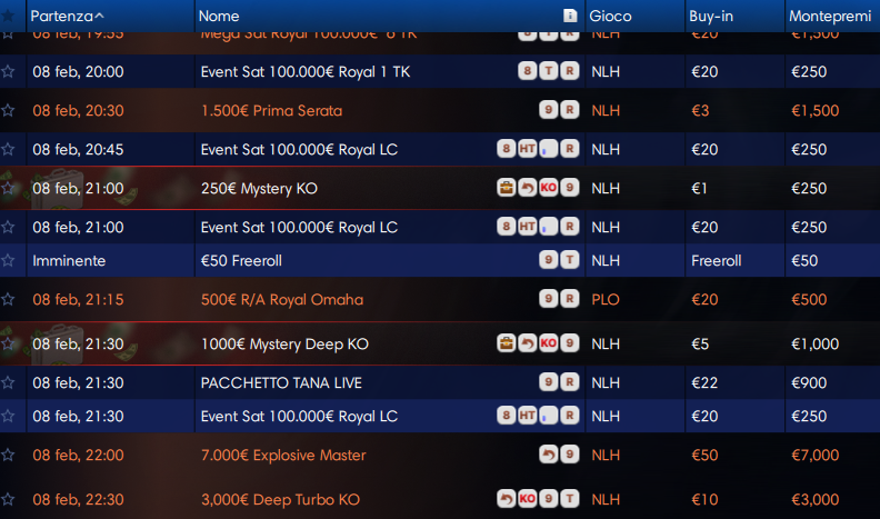 Ed eccoci al circuito iPoker. Il piatto forte qui è costituito da 100mila euro garantiti: si gioca l’iPoker Royal dalle ore 21:00. Il buy-in è di 250 euro. In alternativa c’è il Mini Royal da 20 euro di buy-in e 25mila euro garantiti alla stessa ora.