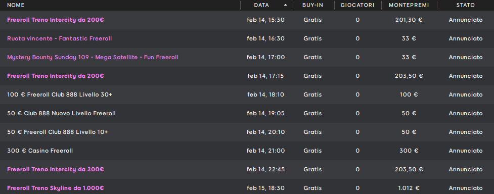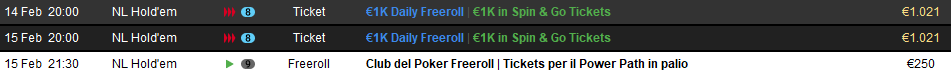Le poker room italiane continuano a proporci ogni giorno tornei gratuiti con bei premi in palio. Andiamo allora a farci un giro nelle varie lobby del ‘punto it’ per capire quali sono i migliori freeroll in palinsesto in questo weekend di metà febbraio.