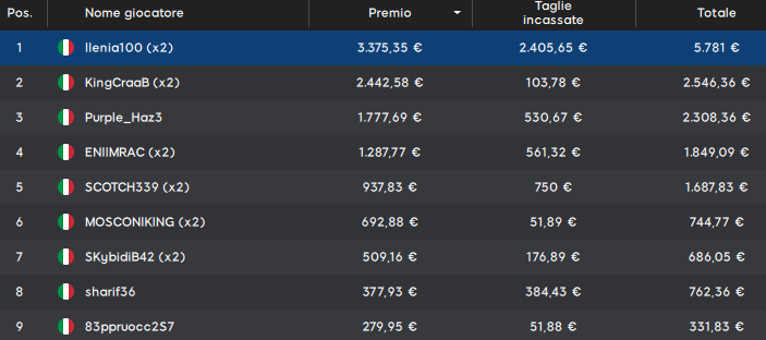 Il primo classificato ‘Ilenia100’ prende ben 5.781 euro totali. Completano il podio ‘KingCraaB’ e ‘Purple_Haz3’. Va poi citato il 16esimo classificato ‘sergente28’ che si merita ben 2.500 euro di taglia e un totale di 2.625 euro.