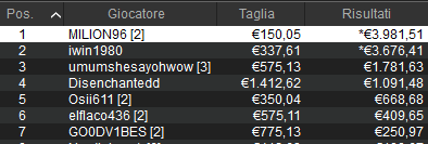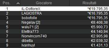 Così alle ore 2:40 il vincitore Luca ‘iL-DottoreX‘ Castellaneta ha preso 19.795 euro invece dei 24.330 euro previsti dal payout. Gli altri due, ‘LAGIOSTRA’ e ‘bobofolle’ prendono 16.795 euro a testa. Quarto posto per ‘Negelav’.