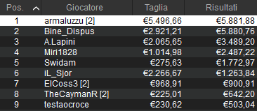 Alle ore 5:49 il sipario è calato pure qua con la vittoria di Gabriele ‘armaluzzu’ Battaglia. Per lui 5.496 euro di taglia e un totale da 11.378 euro. Il runner-up ‘Bine_Dispus’ si accontenta di 8.801 euro. Terza piaza per ‘A.Lapini’.