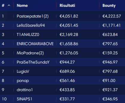 Alle ore 4:06 di stamattina il sipario è calato definitivamente con la grande vittoria di ‘Pastaepatate‘. Per questo goloso player sono arrivati 4.222 euro di bounty e 8.274 euro totali. Al runner-up ‘LelloSbarello94’ vanno 5.222 euro. Terzo posto per ‘T1ANA4LIZZ0’.