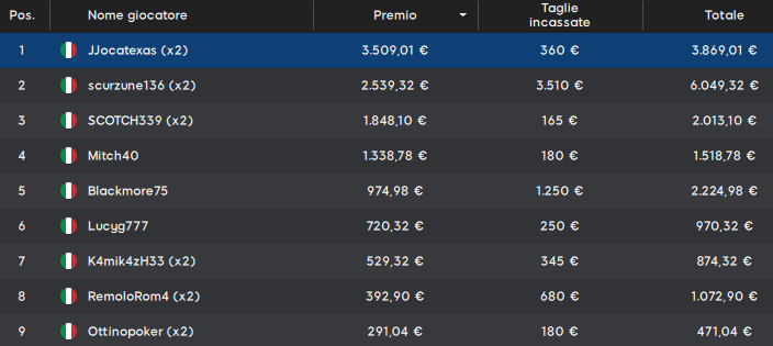 Difficile considerarlo il vero vincitore quando il runner-up ‘scurzune136‘ ha preso ben 3.510 euro di taglia e 6.049 euro in tutto! Completa il podio ‘SCOTCH339’. Citiamo poi la bella taglia da 1.250 euro del quinto classificato ‘Blackmore75’.