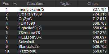In cima al count ‘mongiokami72‘ ha accumulato 827.794 pezzi virtuali. Tutti partivano (e si può ancora partire) con 50.000 in dote. Ricordiamo che le Mystery Bounty verranno assegnate solamente quando si entrerà nella zona dei premi. Dieci di esse varranno almeno 10mila euro! A voi la top ten in attesa del Day 2…