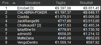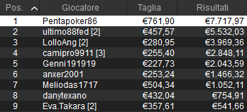 Alle ore 7:41 di stamattina il sipario è calato con la vittoria di ‘Pentapoker86‘ su ‘ultimo88fed’. Al primo vanno 8.479 euro totali, al secondo 5.989 euro. La miglior taglia è stata quella da 2.332 euro di ‘simoneelle98‘, 65esimo classificato.