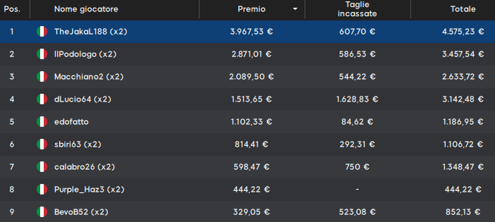 Secondo posto per ‘IlPodologo’ che si fa bastare 3.457 euro. Citiamo poi la taglia da 1.628 euro del quarto classificato ‘dLucio64’. E pure quella da 2.963 euro di ‘Jiren93‘, out 15esimo.
