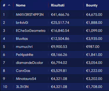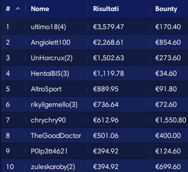 Per quanto riguarda le taglie, il colpaccio lo ha fatto ‘CharlesPonzi8‘ che è uscito 23esimo beccandosi 38.947 euro di bounty; in tutto lui ha incassato 40.176 euro non andando molto distante dal primo classificato. Notevoli pure i 21.470 euro di ‘TattiBarlettta’, out 87esimo.