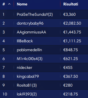 Sono stati poi 568 i premiati con almeno 19 euro. Alle ore 7:07 del mattino il sipario è calato con la vittoria di ‘ultimo18‘ su ‘Angiolett100’. Al primo vanno 3.749 euro, al secondo 3.123 euro totali.