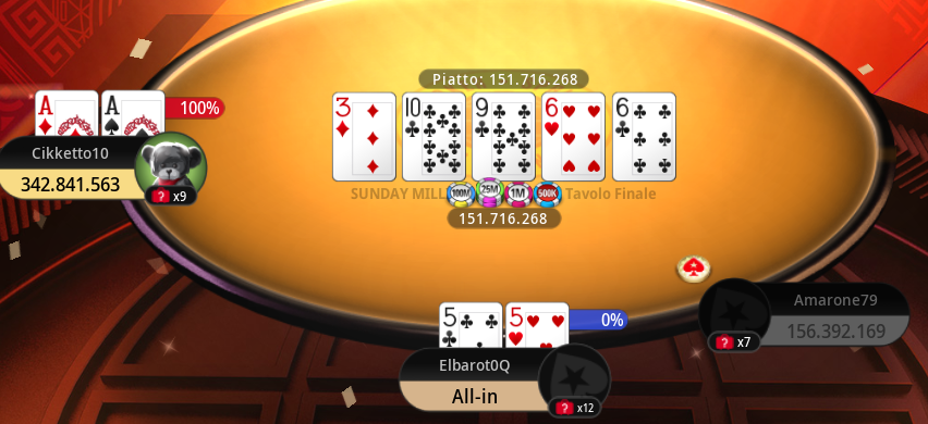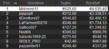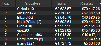 Significativa è stata una mano con board 8-3-A-6-Q (con tre picche a terra) dove ‘Amarone79’ ha puntato al river circa un terzo del proprio stack residuo, foldando sul push dell’oppo. Nell’ultimissimo spot invece si finisce ai resti su un flop 3-2-4 con due quadri. Il leader ‘Cikketto10’ pusha con K-7 ed è dietro a 4-Q, ma un K enorme al turn ribalta la mano.
