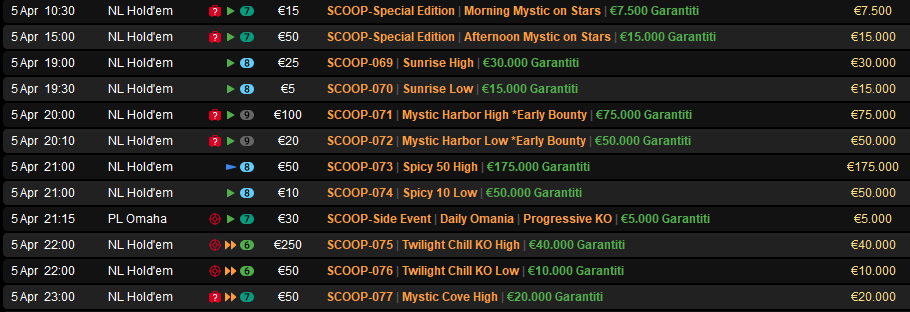 Nelle room PokerStars e Sisal va in scena ancora lo SCOOP 2026 con uno Spicy 50 a ingolosire tutti. Tra i vari eventi occhio anche al doppio Mystic Harbor Early Bounty.