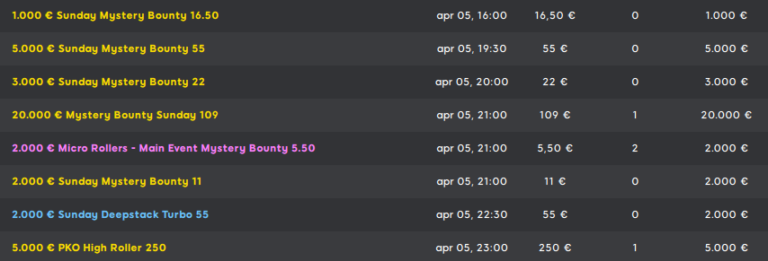 Belli pure il Sunday Mystery Bounty 55 e il PKO High Roller 250. Good luck a tutti! Se vuoi giocare gli esclusivi tornei di 888Poker è necessario registrarti alla room.