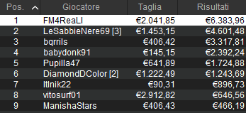 Il vincitore ‘FM4ReaLI‘ si becca 8.425 euro totali contro i 6.054 euro del runner-up ‘LeSabbieNere69’. La miglior taglia è stata quella dell’ottavo classificato ‘vitosurf01‘: oltre 2.900 euro.