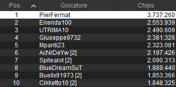 La scalata verso il final table riprende alle 21:00 di stasera con una prima moneta da oltre 27.480 euro nel mirino di tutti. Domina il count ‘PierFermat‘ con 3.737.260 di stack quando l’avg è di 798.888 per la precisione. A voi la top dieci attuale…
