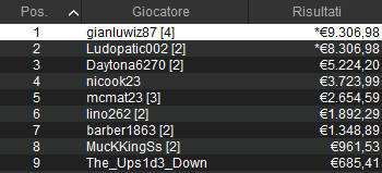 Tra i tornei terminati spicca invece questo Mystic Clash Mystery Bounty che metteva in palio 100mila euro come minimo dalle ore 20:00. Qua in mezzo a 1.110 rientri e 583 ITM tutto è terminato alle ore 6:08 di stamattina.