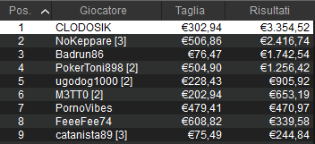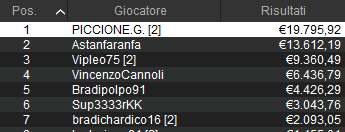 Il sipario è calato definitivamente alle 5:53 quando Giovanni ‘PICCIONE.G.’ Piccione ha avuto la meglio su ‘Astanfaranfa’. Nella serata dei reg qui il primo prende 19.795 euro contro i 13.612 euro del secondo. Terzo posto per ‘Vipleo75’.