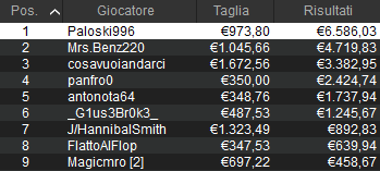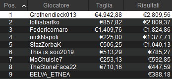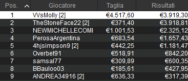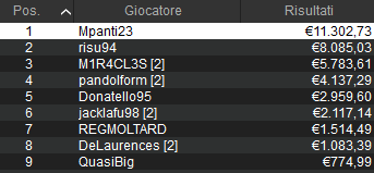 Tra i tornei classici spicca questo NoS delle ore 21:00 che ha totalizzato 204 rientri e 134 posti ITM. Alle ore 4:31 qui il sipario è calato con il trionfo da 11.302 euro di ‘Mpanti23‘. Secondo posto da 8.085 euro per ‘risu94’. Bravi loro e gli altri finalisti dell’evento!