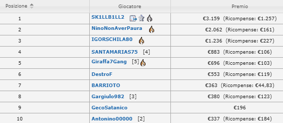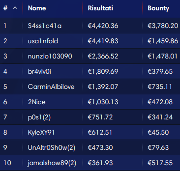 Ne hanno approfittato 81 pagati che hanno preso almeno 97 euro. Alle ore 4:33 il sipario è calato con la grande gioia di ‘S4ss1c41a‘: per lui 8.200 euro complessivi. Secondo posto da 5.879 euro per ‘usa1nfold’, terzo per ‘nunzio103090’.