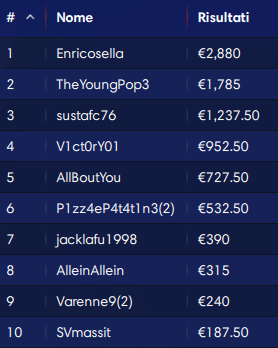 Possiamo darvi finalmente tutti i numeri e i risultati. Oltre 8mila euro sono finiti nel conto del più fortunato vincitore stanotte. Ma anche il runner-up non può lamentarsi… Vi lasciamo con tutti i dettagli e i payout del caso, augurandovi una splendida settimana. Al prossimo weekend!