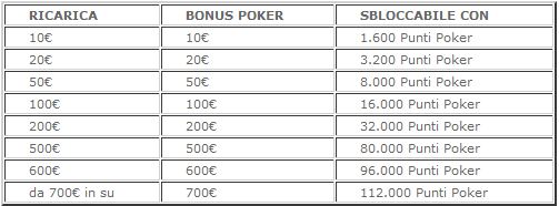 Scegliendo “Benvenuto Poker” al momento della registrazione si può usufruire del Bonus del 100% che Poker Club ha messo a disposizione di tutti i suoi nuovi clienti: si può arrivare ad un massimo di 700€. Il bonus previsto su Poker Club è di tipo progressivo, ovvero viene rilasciato in parti di 5 euro: per ogni euro giocato sulla room di Lottomatica si guadagnano 40 Punti Poker, ogni 800 punti accumulati si sbloccano 5 euro di bonus.